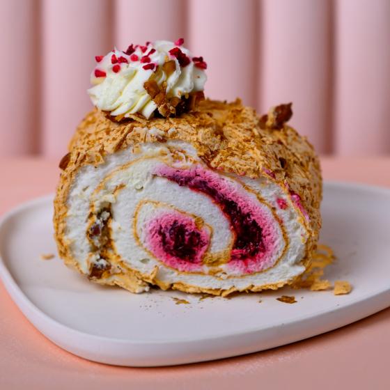 Меренга (белок, сахарная пудра, миндаль, лимонный сок), крем (творожный сыр, сливки 33%, сахарная пудра), начинка ягодная (малина/клубника/вишня, сахар, кукурузный крахмал, вода)