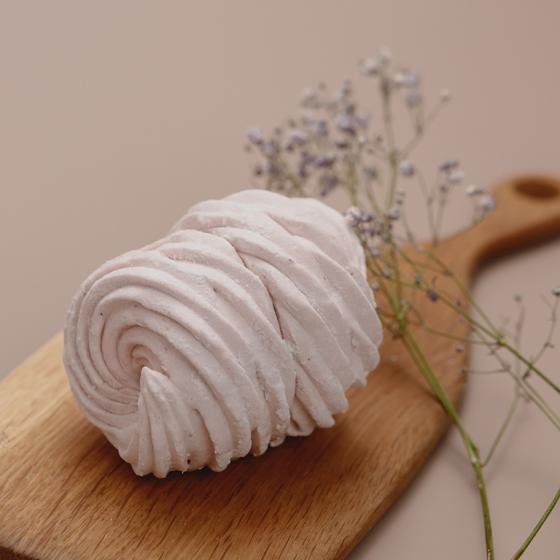 Воздушный зефир на основе яблочного и клюквенного пюре. Состав: сахар, яблочное пюре, клюквенное пюре, белок, агар-агар.